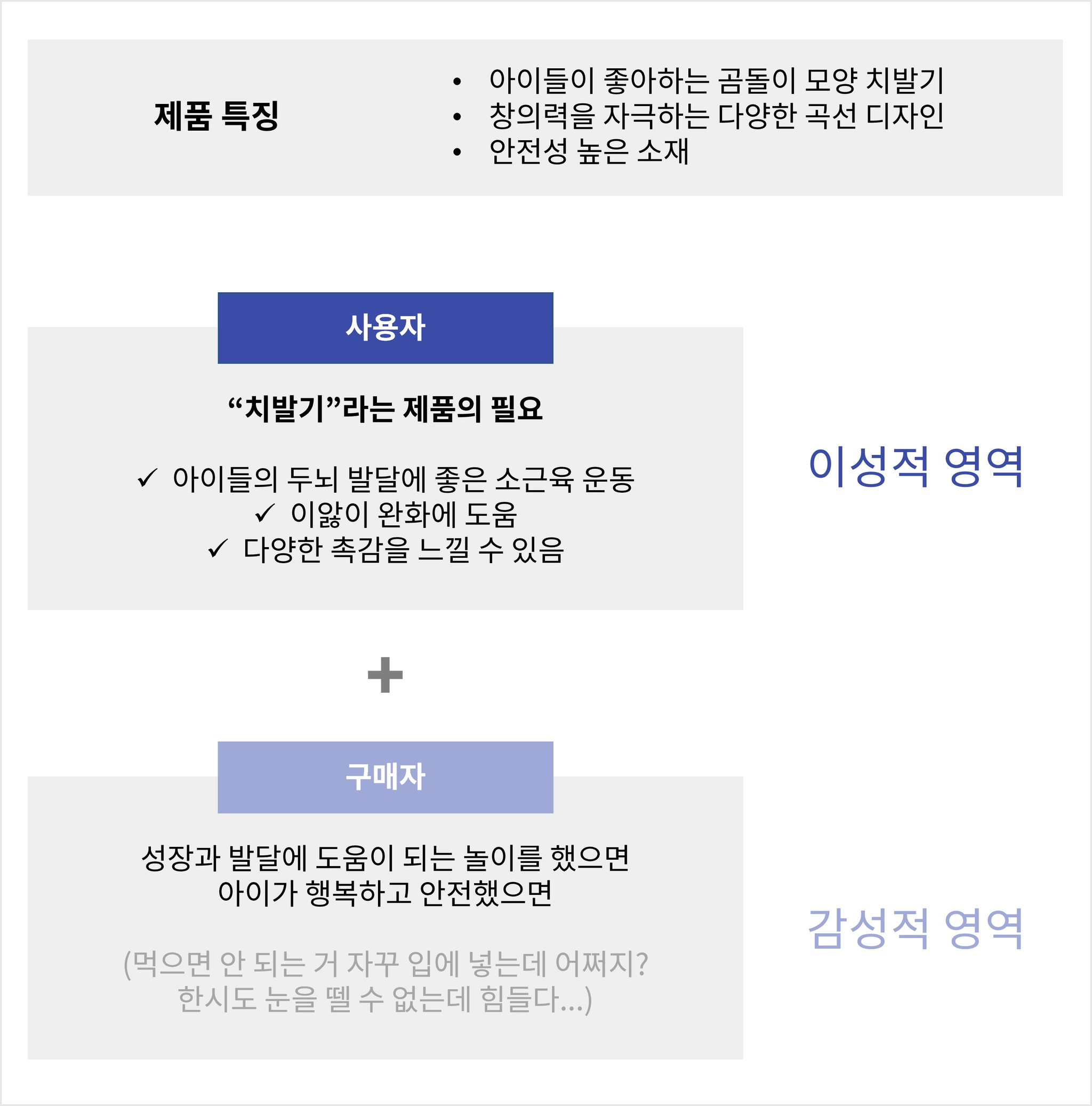 아래 사진은 위 세 가지 스텝에 따라 제품 특징을 분석하고, 이성적·감성적 관점에서 타깃을 이해한 예시이다. 상세페이지를 기획하기 전에 제품과 타깃을 깊게 이해하는 시간을 충분히 가져보시길 바란다.