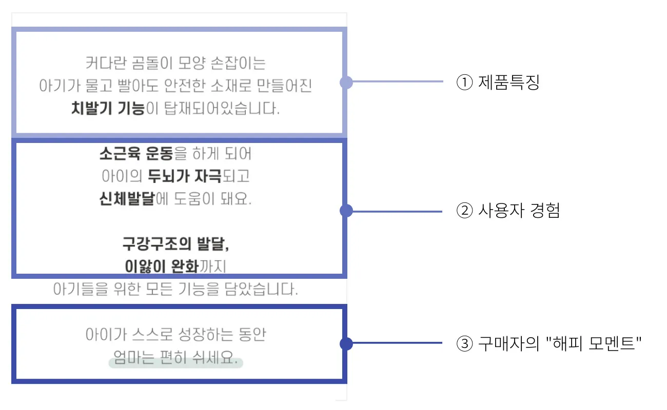 <①제품 특징>과 <②사용자 경험>은 구매자 타깃의 이성을 자극한다. 이는 해피 모멘트에 대한 '근거'를 마련해 주고, 구매를 결정하는 데 중요한 역할을 한다다.