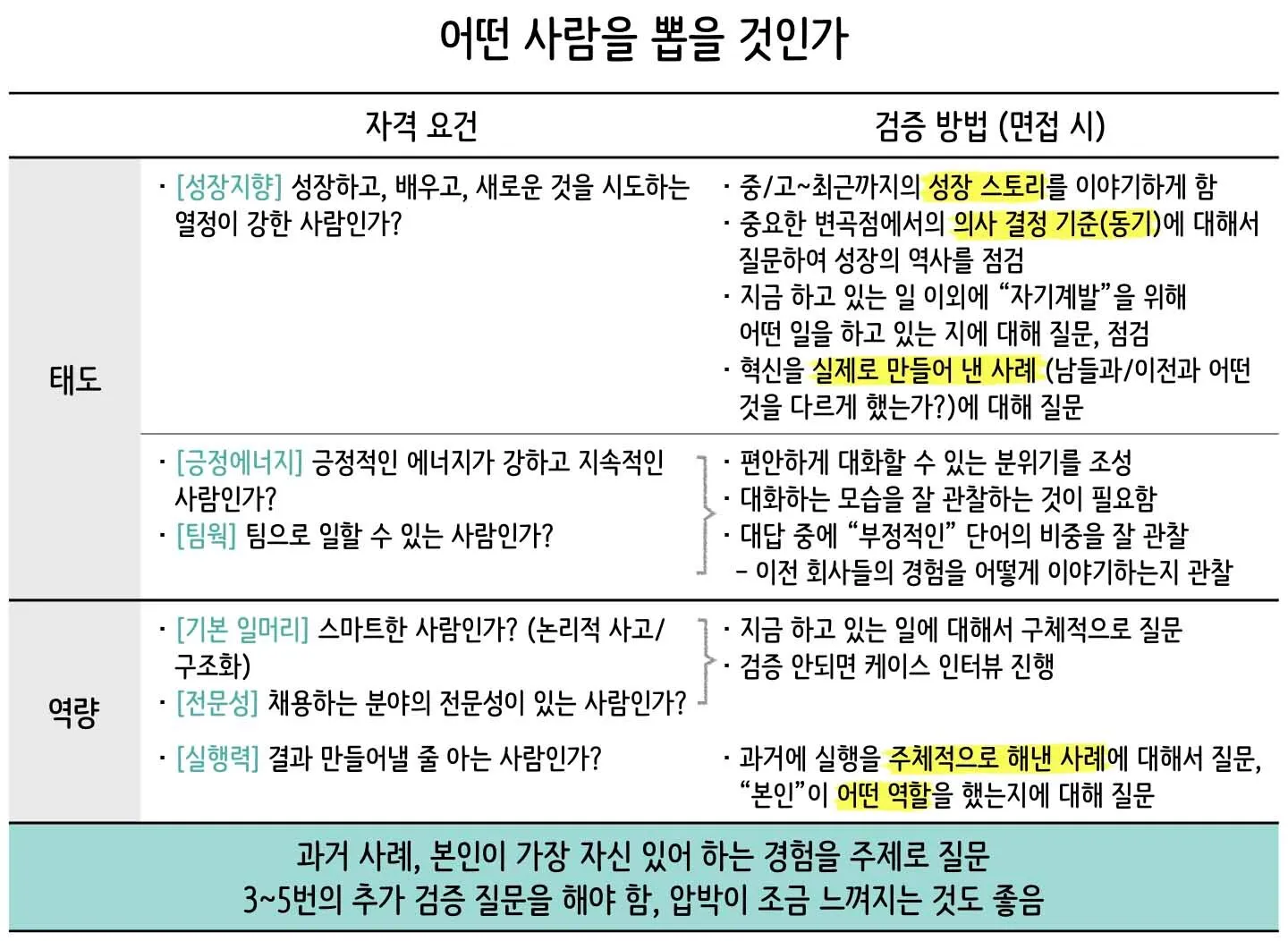 전자는 그 동안 해온 일들의 결과물을 보면 상대적으로 쉽게 알 수 있지만 후자는 정성적인 면이 커서 검증이 어려운 영역이기 때문에 더 그렇다. 아무리 능력 있는 사람도 문화적으로 화학적인 결합이 맞지 않는 품성이면 실력을 발휘하기 힘들고, 팀도 힘들어진다.