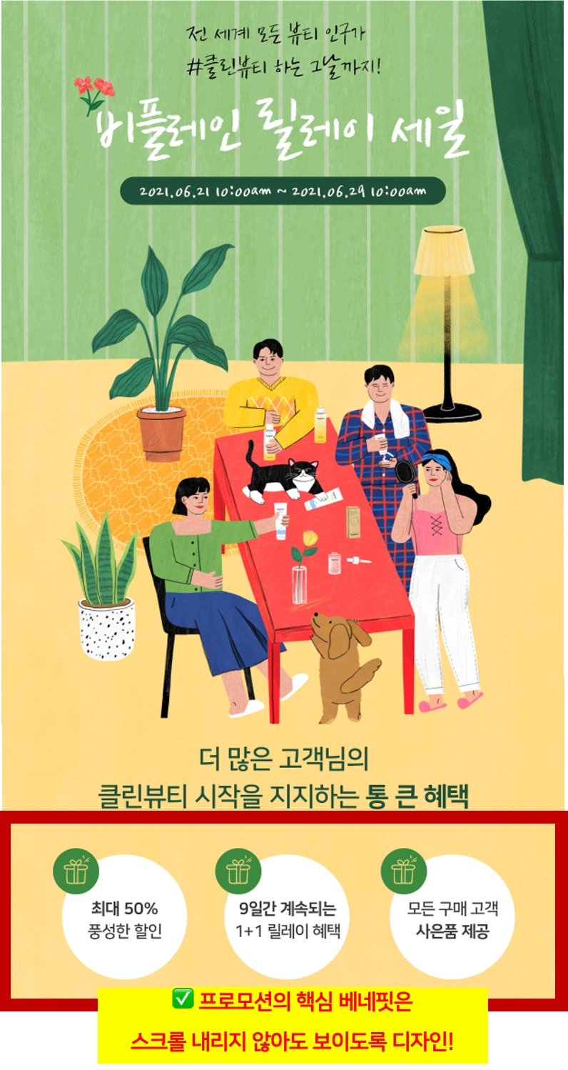 따라서, 세일이나 이벤트를 소개하는 페이지에서는 고객이 스크롤을 내리지 않아도 첫 화면에서 어떤 혜택이 있는지 볼 수 있도록 구성하는 게 좋습니다.