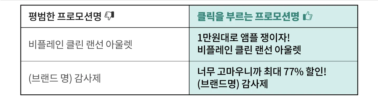 웹에서 고객들의 이목과 클릭을 끌어내기 위해서는 최대 혜택을 짚어 내서 부제에 넣거나 카피라이팅 해주셔야 합니다. 즉, 너무 정직한 프로모션명 그대로 활용하지 마시고 해당 프로모션에서 가장 강력한 혜택을 타이틀에 명시하여 미끼처럼 활용하셔야 합니다.