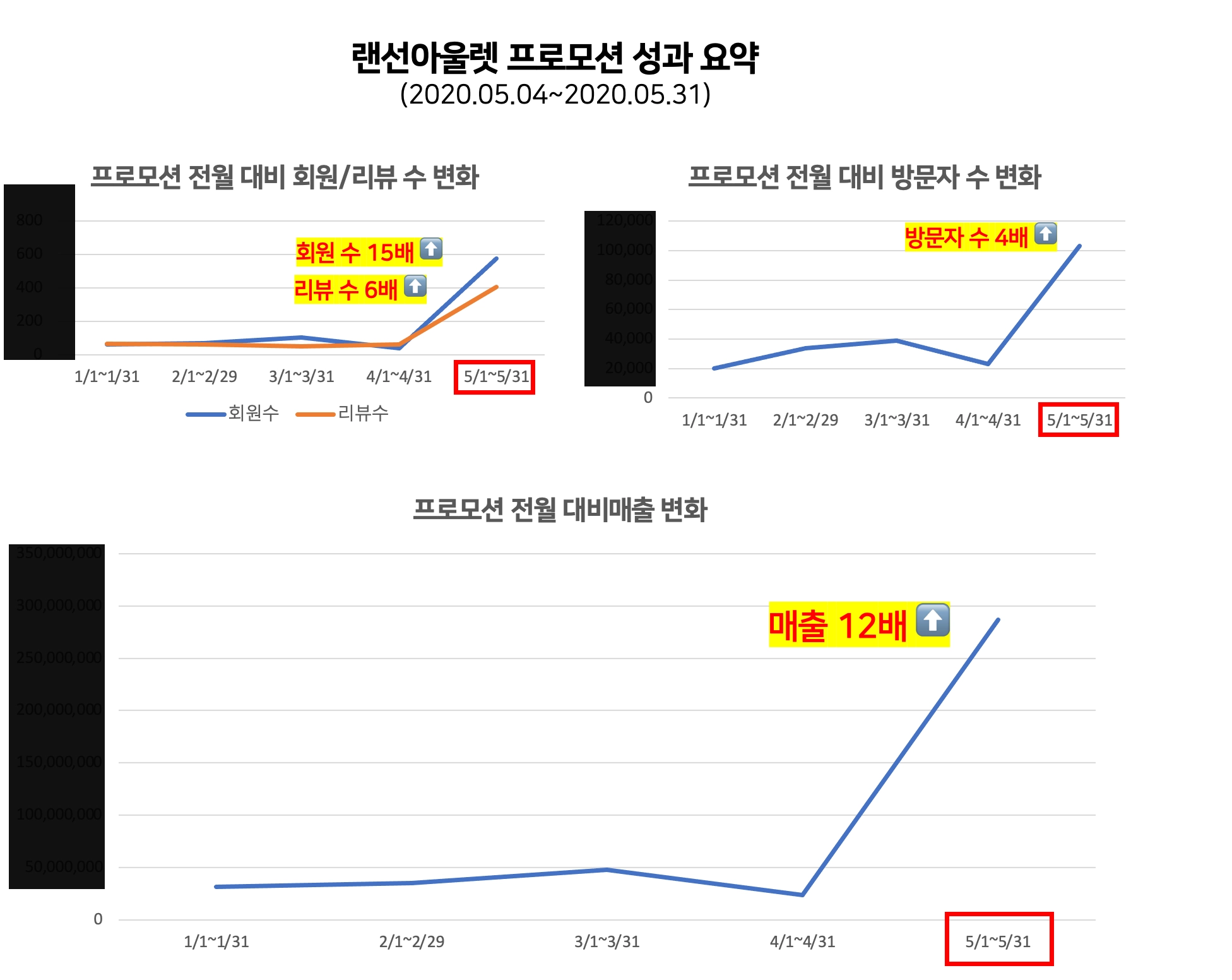 브랜드 론칭 1년 차에 진행한 프로모션임에도 불구하고 '회원 수 15배, 리뷰 수 6배, 방문자 수 4배, 매출 12배'라는 성과를 달성할 수 있었습니다.