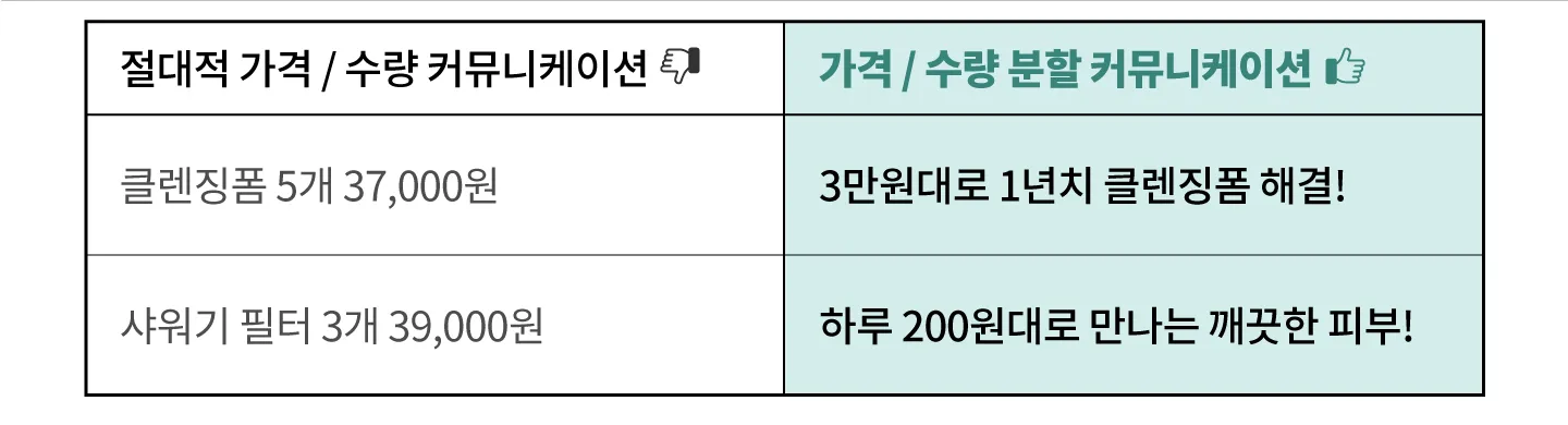 특히 용량 당 단가, 사용 일수 당 단가 등으로 분할하여 커뮤니케이션하는 방법은 작은 차이지만 고객의 인식을 크게 바꿀 수 있습니다.
