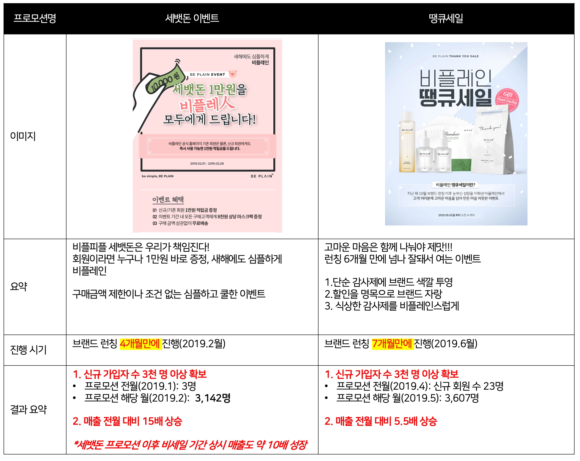 브랜드명을 대도 1000명 중 1000명이 모두 몰랐을 시절이지만 탄탄한 프로모션 구조 덕분에 두 프로모션 모두 신규 가입자 수 3000명 이상, 매출 5~15배 상승 등 좋은 성과를 보이며 브랜드 성장의 첫걸음을 마련해 주었습니다.
