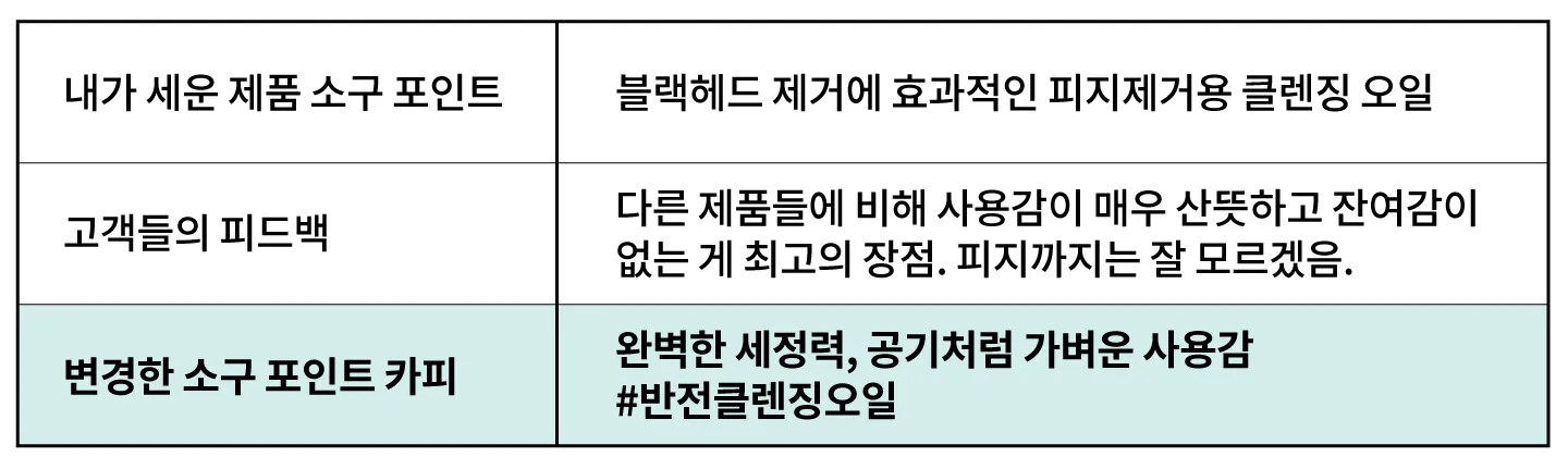 예를 들어 우리는 이 제품이 '블랙헤드 제거에 효과적'이라고 생각하며 핵심 소구 포인트로 설정하였는데,