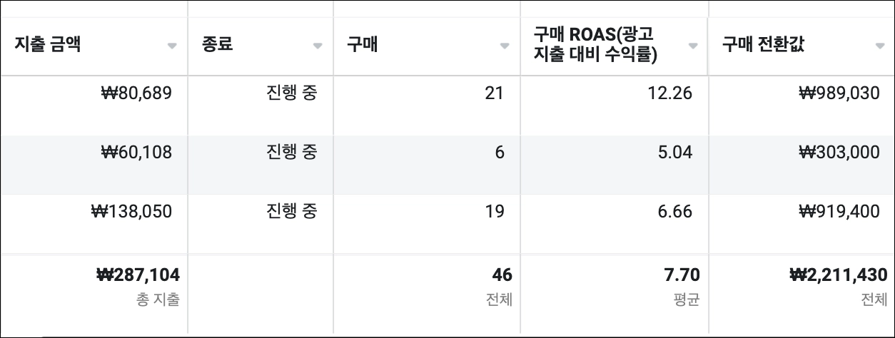 필자는 실제로 한 제품당 광고 소재를 최대 20개씩 만들어 하나의 캠페인에 배치한다. 아래 이미지처럼 알아서 성과가 좋은 소재에는 광고비가 집중되고, 성과가 떨어지는 소재에는 광고비가 투입되지 않을 테니까.