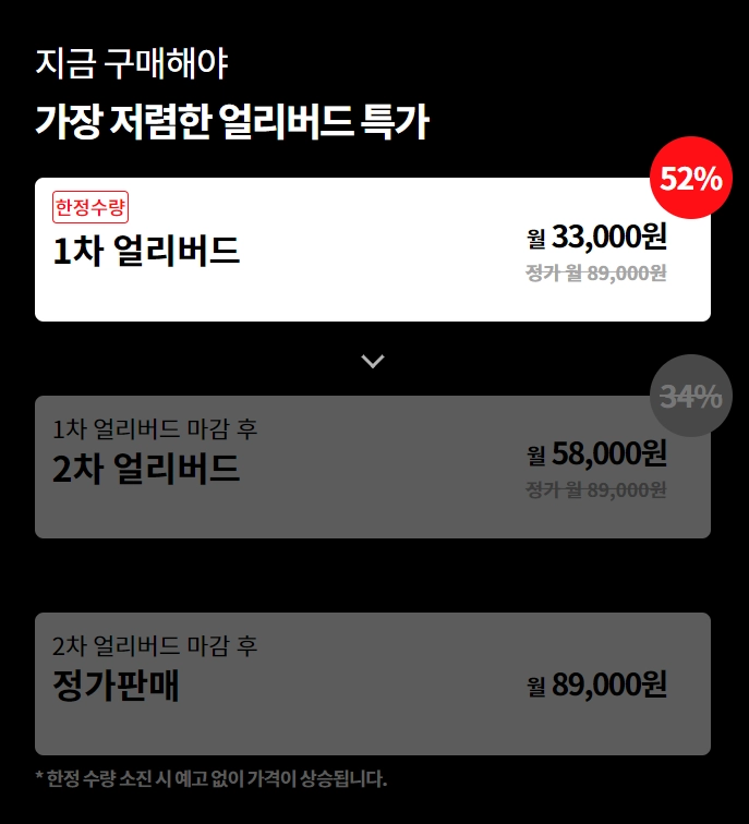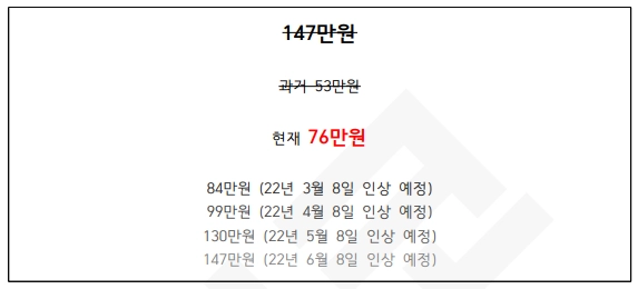 이렇게 구체적인 날짜를 표기해서 '언제 인상 예정입니다'라고 알려주면, 사람들은 가격이 인상되기 전에 구매를 하려고 안간힘을 쓴다. 이미 저렴한 가격을 보았기 때문에, 미래에 손해 보고 싶지 않은 심리가 발생하는 것.