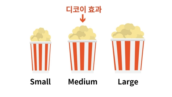 이렇게 2가지만 있을 때는 스몰 사이즈를 고를 확률이 훨씬 높다. 라지 사이즈는 뭔가 남길 것 같고 비싸게 느껴지기 때문. 만약, 미디엄 사이즈라는 선택지가 추가되었다면, 이때 우리는 미디엄 사이즈 팝콘을 고를 확률이 높아진다.