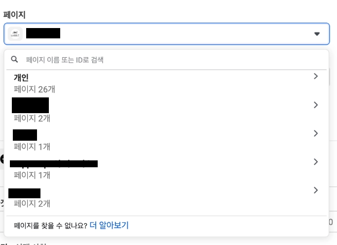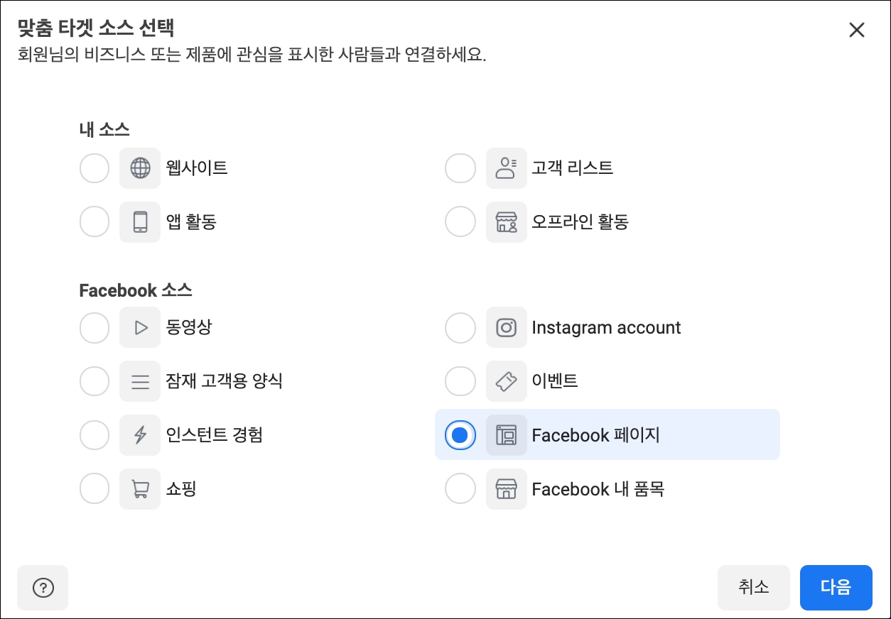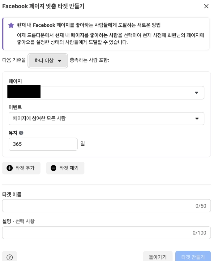페이지: 맞춤 타겟을 생성할 페이스북 페이지를 선택한다.