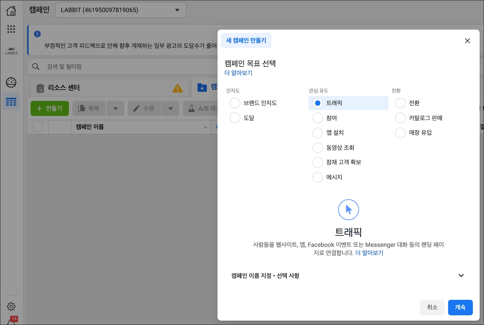 광고 관리자에서 [만들기]를 클릭하여 [트래픽] 캠페인 목표를 선택한 다음, [계속] 버튼을 클릭한다.*