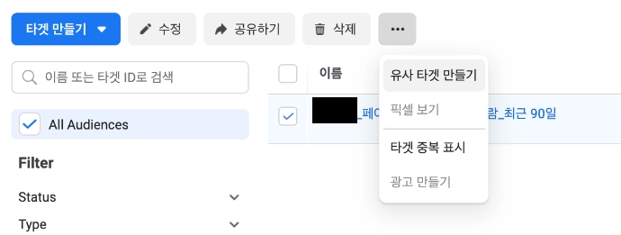 만들어둔 '맞춤 타겟'에 체크를 하면 아래 이미지와 같이 [삭제] 버튼 옆에 […] 아이콘이 나타난다. 이 아이콘을 클릭하면 [유사 타겟 만들기] 메뉴가 나타난다. 해당 메뉴를 클릭해보자.