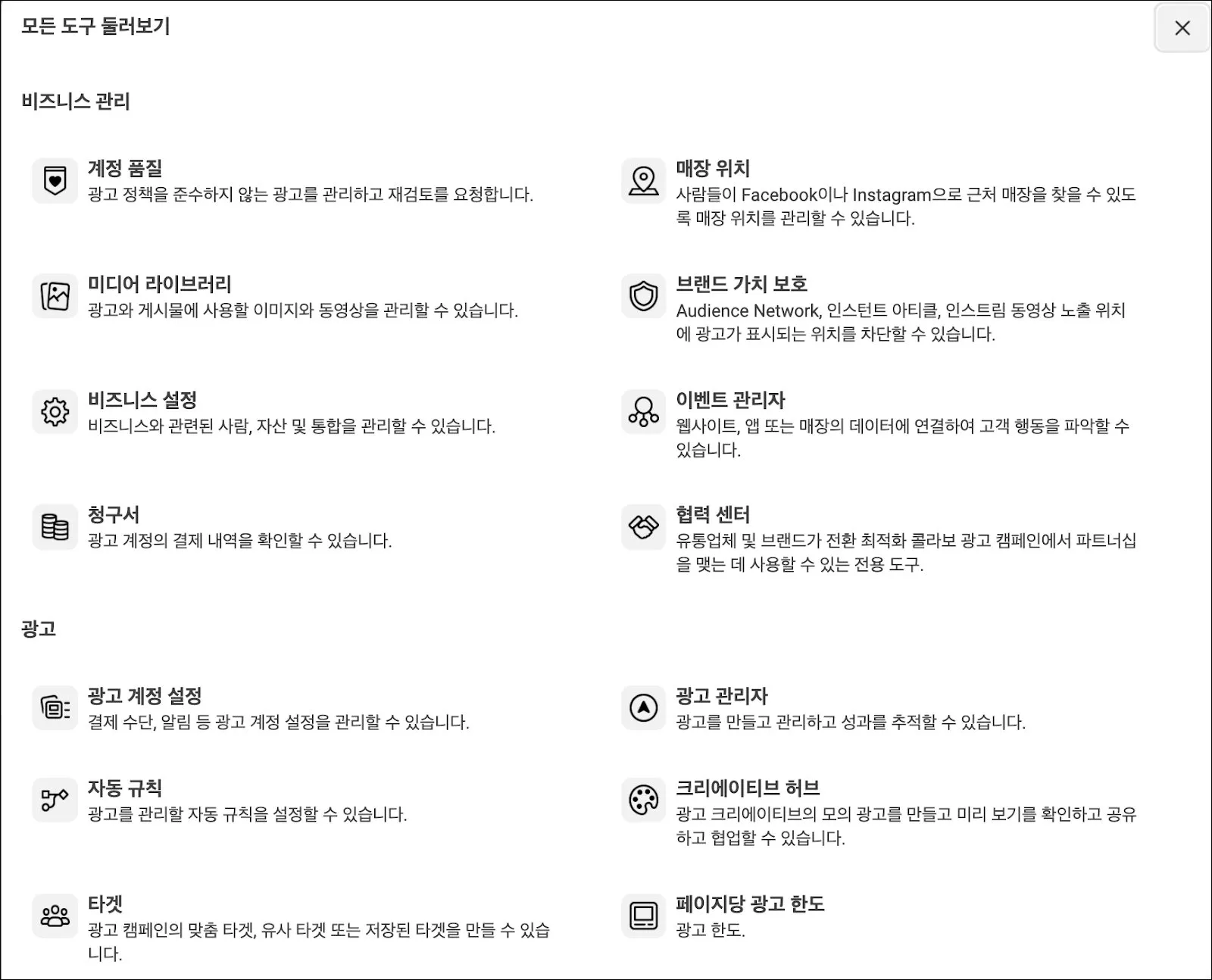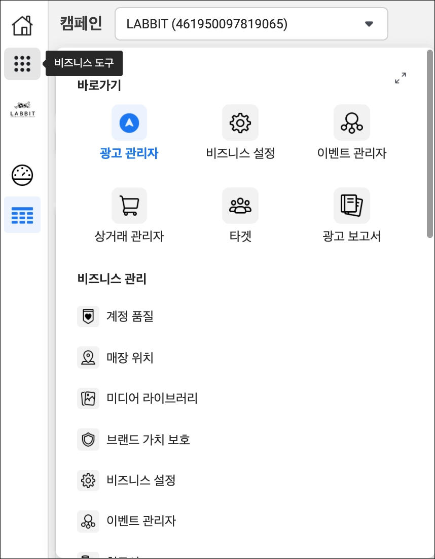 우선은 우리가 줄곧 봐왔던 광고 관리자에서 시작한다. 광고 관리자 왼쪽 상단에 바둑판 모양으로 된 아이콘이 있다. 아이콘을 클릭해 [비즈니스 도구] 메뉴를 보면 광고 관리자 내에서 제공해주는 다양한 메뉴들이 등장한다. [바로가기] 영역에는 자주 사용하는 메뉴들이 우선적으로 나타난다.