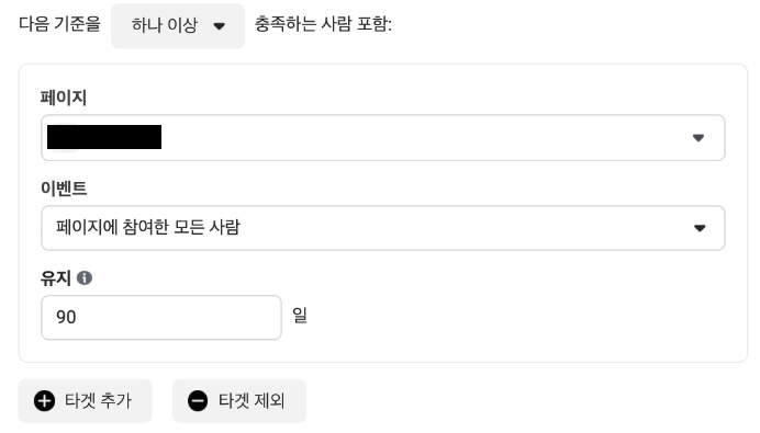 선택한 페이스북 페이지 내에서 어떤 행동을 했던 사람들을 리마케팅 맞춤 타겟 모수로 정의할 것인지 세팅하는 영역이다.