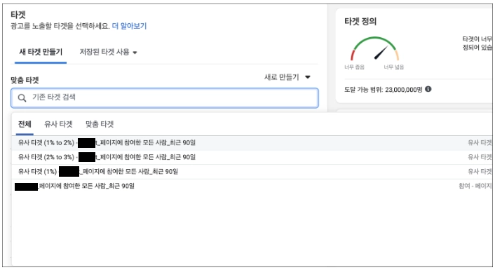 타겟 영역의 [맞춤 타겟] 메뉴에 마우스 커서를 올려두면 아까 만들어뒀던 맞춤 타겟과 유사 타겟의 목록이 아래와 같이 나타난다.