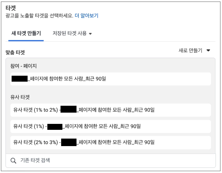 유사 타겟을 만들어주는 원천이 될 수 있는 데이터 소스(맞춤 타겟)를 선택하는 영역이다. 지금은 우리가 만들어준 맞춤 타겟이 [OOOO_페이지에 참여한 모든 사람_최근 90일]이기 때문에 해당 타겟이 들어가 있는 것을 볼 수 있다.