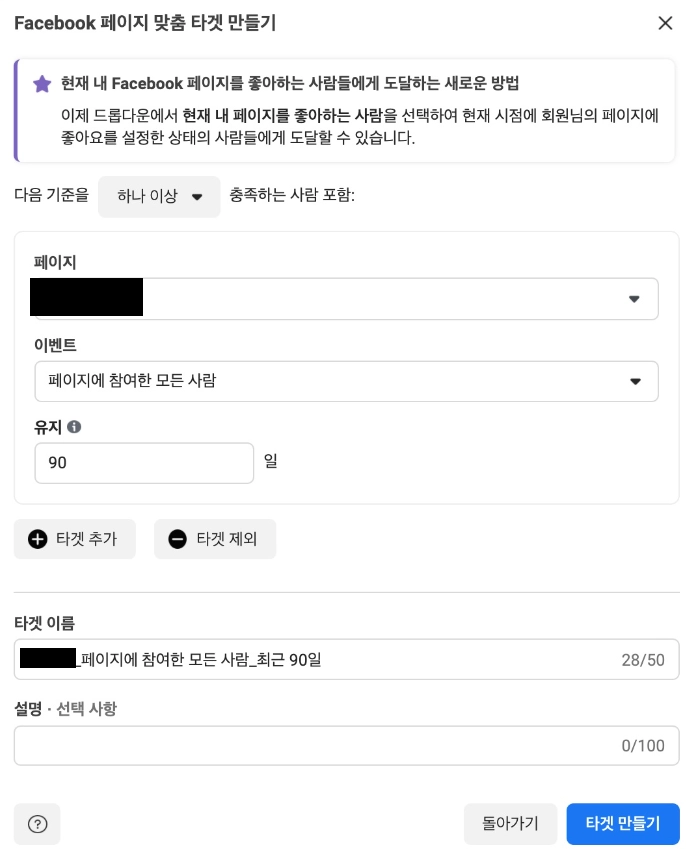 유지 영역에 '90일'이라고 적게 되면 최근 90일 동안 페이스북 페이지에 참여한 모든 사람을 맞춤 타겟으로 지정한다. 오늘이 3월 27일이라면 3월 27일 기준으로 최근 90일이 되기 때문에, 한 번 타겟을 지정해두면 시간이 지나더라도 따로 업데이트할 필요는 없다.
