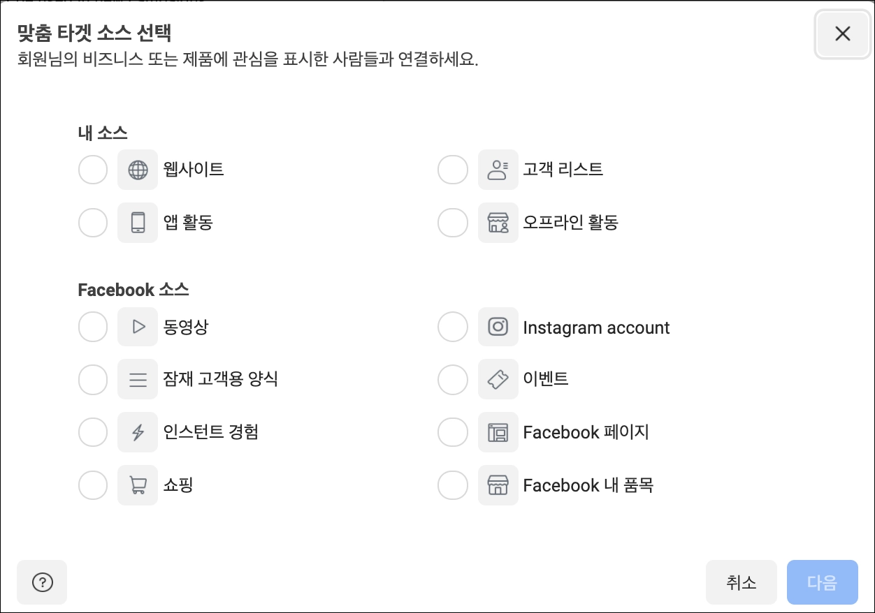 맞춤 타겟을 만드는 방법은 2가지 카테고리(내 소스&페이스북 소스)에 각각 4개, 6개씩 총 10가지이다. 하나씩 살펴보자.