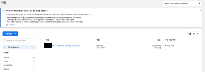 이렇게, [Labbit_페이지에 참여한 모든 사람_최근 90일]이라는 이름의 맞춤 타겟과 가장 유사한 유저 [상위 0~1%], [상위 1~2%], [상위 2~3%]의 유사 타겟 덩어리 3개가 생겼다.