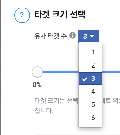 [타겟 크기 선택]을 통해 유사 타겟의 규모를 정의할 수 있다. [유사 타겟 수]라고 되어있는 부분의 드롭다운 메뉴를 클릭하면 타겟 덩어리의 개수도 정의할 수 있다. 개수를 [3]으로 바꿔보겠다.