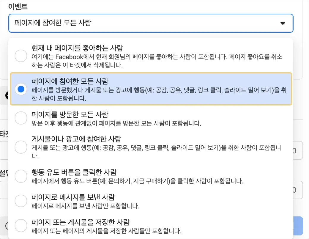 다양한 행동들이 있지만, 어떤 행동이라도 비즈니스 입장에서는 유의미한 행동을 했던 유저들이기에 모든 행동들을 포함하여 타겟을 만들어주는 [페이지에 참여한 모든 사람] 영역을 클릭한다.