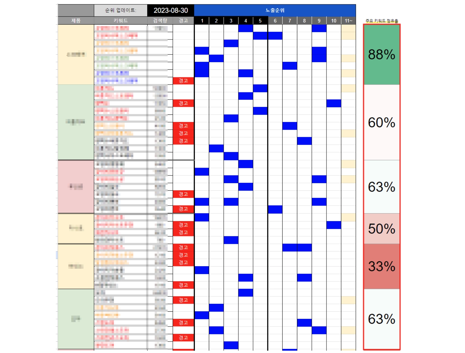 ㄴ 주요 매체/순위/키워드에 따른 바이럴 점유 현황 관리 시트.