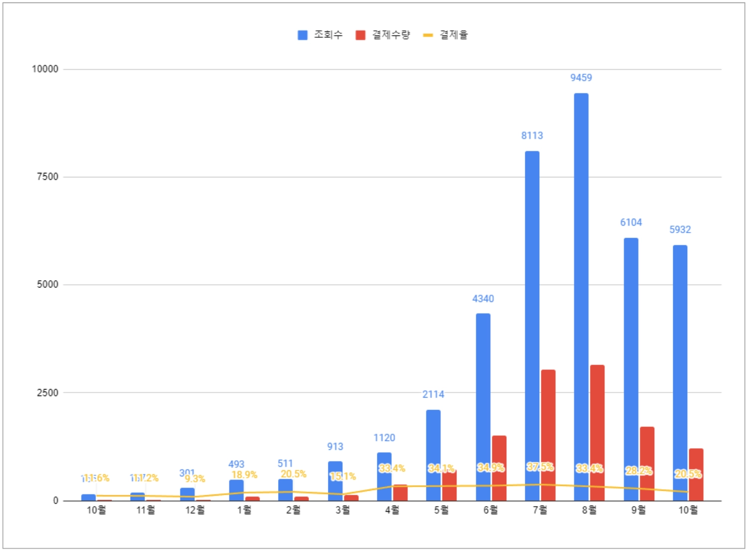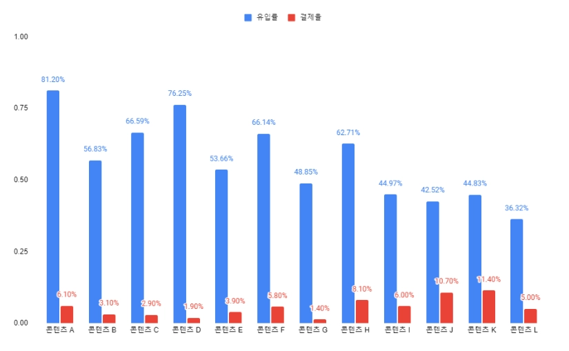 직접 작성한 파워콘텐츠 게시글별 유입률/결제율 차트