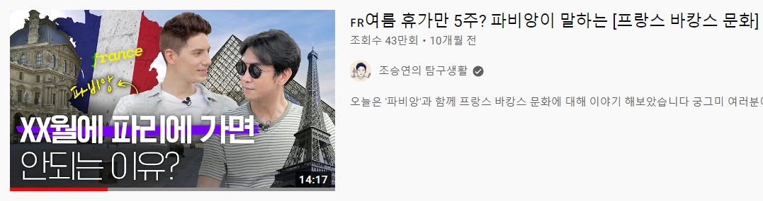 〈인생치트키〉는 손글씨 느낌의 일러스트 디자인으로 썸네일에 이목을 집중시킵입니다. 〈직장내일〉도 앞선 사례와 비슷하지만 〈인생치트키〉 채널보다 통일된 썸네일 가이드를 정하고, 규칙적인 디자인을 유지함으로써 채널을 팔로우하는 사람들에게 덜 어지러운 느낌을 줍니다.
