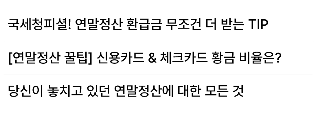만약 '연말정산'을 주제로 한 콘텐츠의 제목을 써야 한다면, 해당 키워드를 네이버 뉴스탭과 구글, 유튜브에 검색해보세요. 혹은 즐겨보는 잡지(코스모폴리탄, 여성동아, 지큐 등)의 온라인 사이트에 검색해봐도 좋습니다. 연말정산이라는 키워드가 들어간 콘텐츠 제목을 모니터링해보세요.