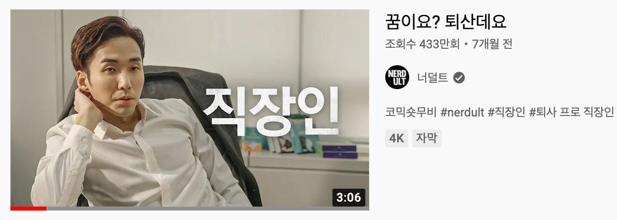 만약 이 콘텐츠를 검색에 잘 노출되도록 수정한다면 〈"제 꿈은 퇴사입니다만?" K-직장인 현실고증〉으로 수정해볼 수 있습니다. '퇴산데요?'라는 구어체에서 '퇴사'라는 단어를 살리고, '직장인'이라는 단어를 추가했습니다. 퇴사나 직장인이라는 키워드를 검색했을 때 해당 영상이 노출될 확률을 높였죠.