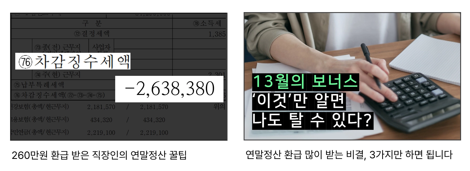 전자는 썸네일에 사진만 넣어 제목 포커싱 전략을 적용한 사례, 후자는 제목 서브 전략을 적용한 사례입니다. 두 콘텐츠 모두 검색에 잘 노출될 수 있도록 연말정산, 환급, 꿀팁 등의 키워드를 배치했죠. 유튜브 카피라이팅 전략의 차이가 이제 눈에 잘 들어오시나요?