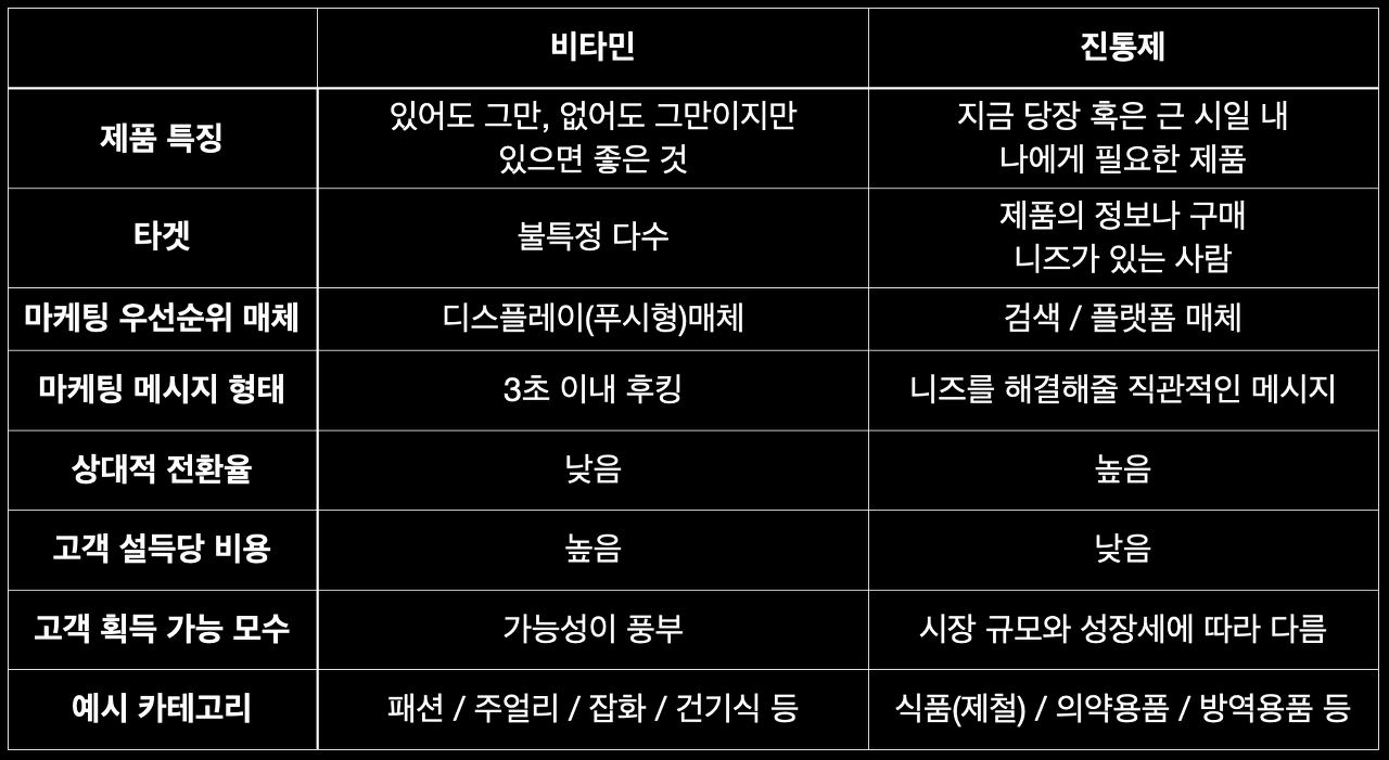 그래서 비타민과 같은 브랜드는 '디스플레이, 푸시형 매체' 즉 메타, 인스타그램, 구글, 유튜브 등의 매체들을 통해 마케팅의 리소스를 우선적으로 집중해서 사용한다.